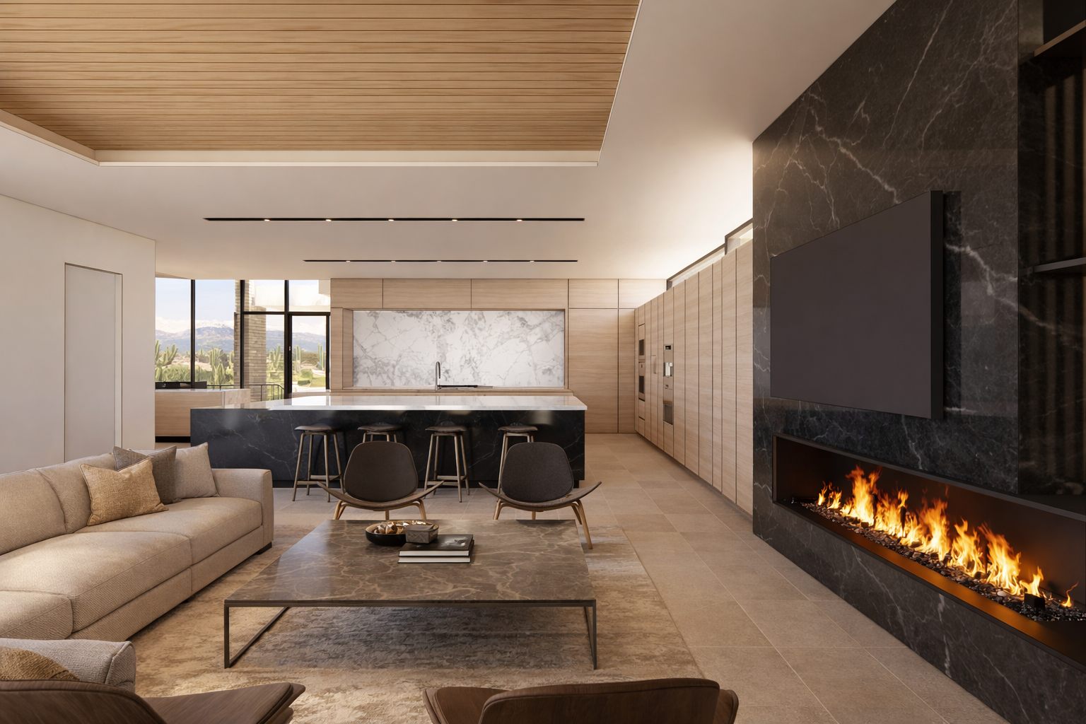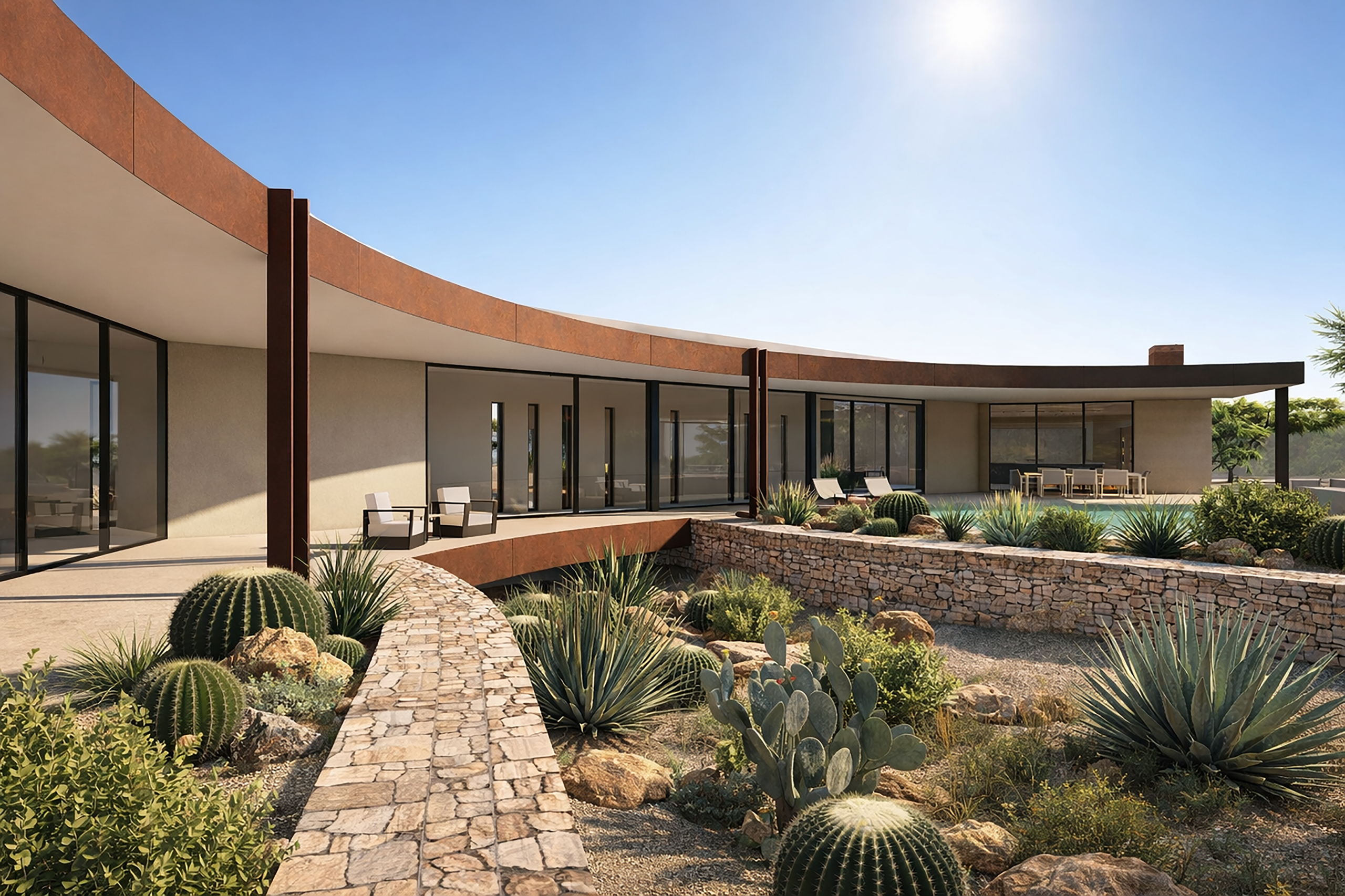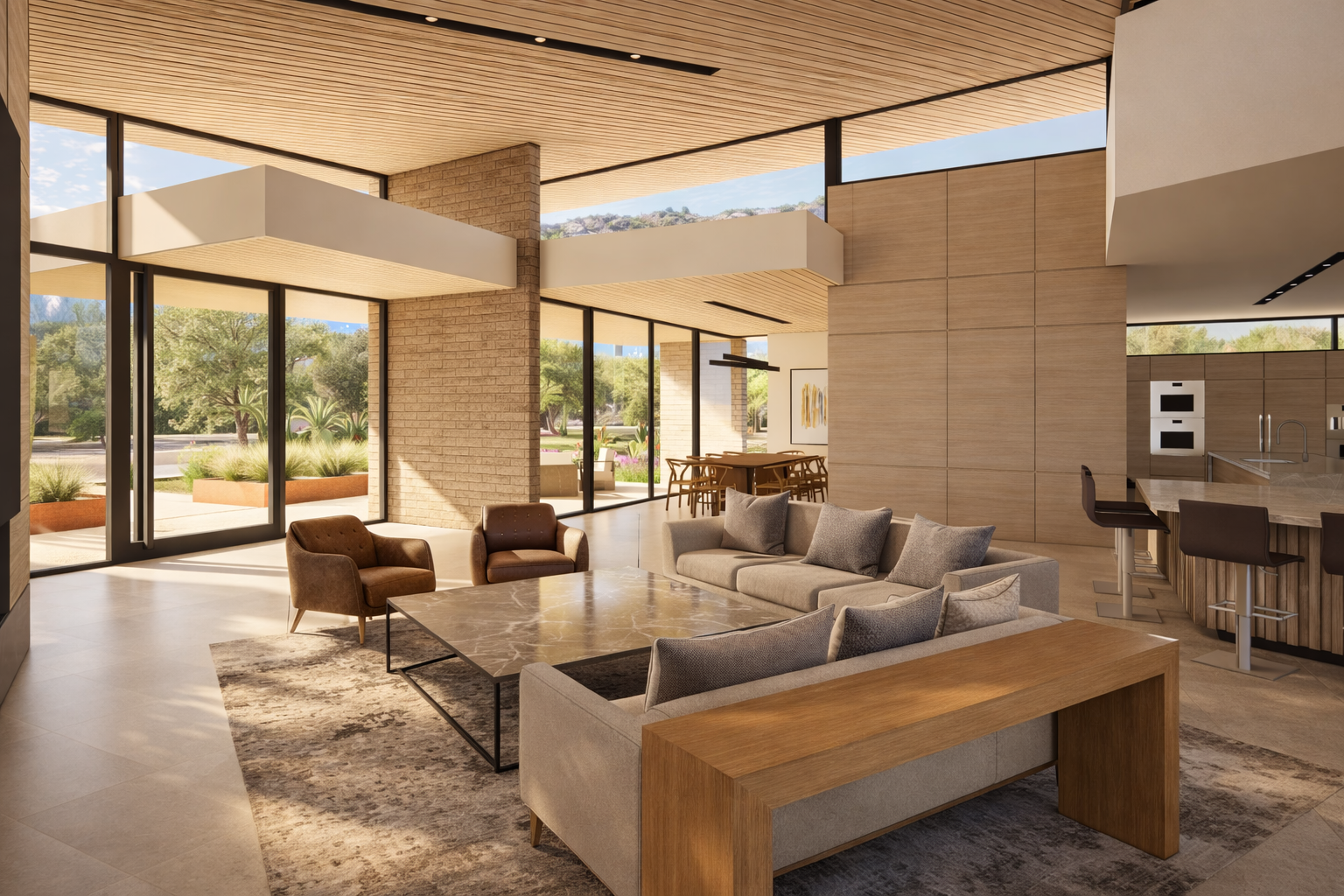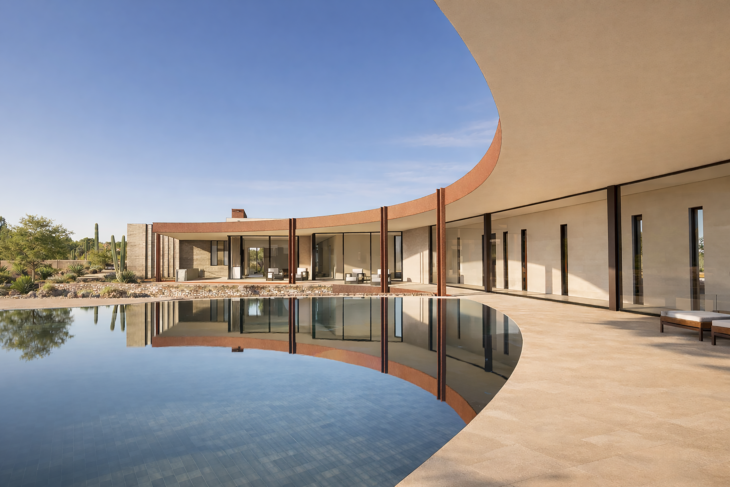 Designed to harmonize with its natural surroundings, while making its own bold statement, Crescent View exploits the natural grandeur of the desert wash traversing the site, while walls of glass and soaring roof forms reach out to capture mountain views. Social, family and entertainment zones are separated from peaceful private bedroom zones via a dramatic curved indoor bridge spanning the desert wash.
